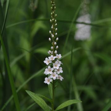 湿地に生える多年草。横にはう地下茎から直立する地上茎を出し、高さ40~70cmになる。茎は円柱形。葉は披針形で、互生し、柄はない。両面ほとんど無毛、長さ4~7cm、幅1cm前後。茎の先にふさ状の細長い花のかたまりをつける。花穂は直立して、密に花をつけ、長さ10~20cm。花は白色で5裂し、径5~6mm。オカトラノオに似ているが、それよりも小型。花の穂を虎のしっぽに見立てたもの。花期:7~8月。
