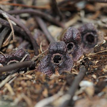 常緑の多年草。葉は長い柄があり、卵形で基部は深いハート形。多くは表面に白い斑紋があり、脈に沿ってへこむ。花は葉柄の基部に地面に埋もれるように咲き、径25~40mm、黒紫色。がくは筒状で長さ約10mm、がく裂片は三角状で、筒部より長い(17~40mm)。静岡県中部以西、愛知県・岐阜県・三重県に分布。花期:10~3月。